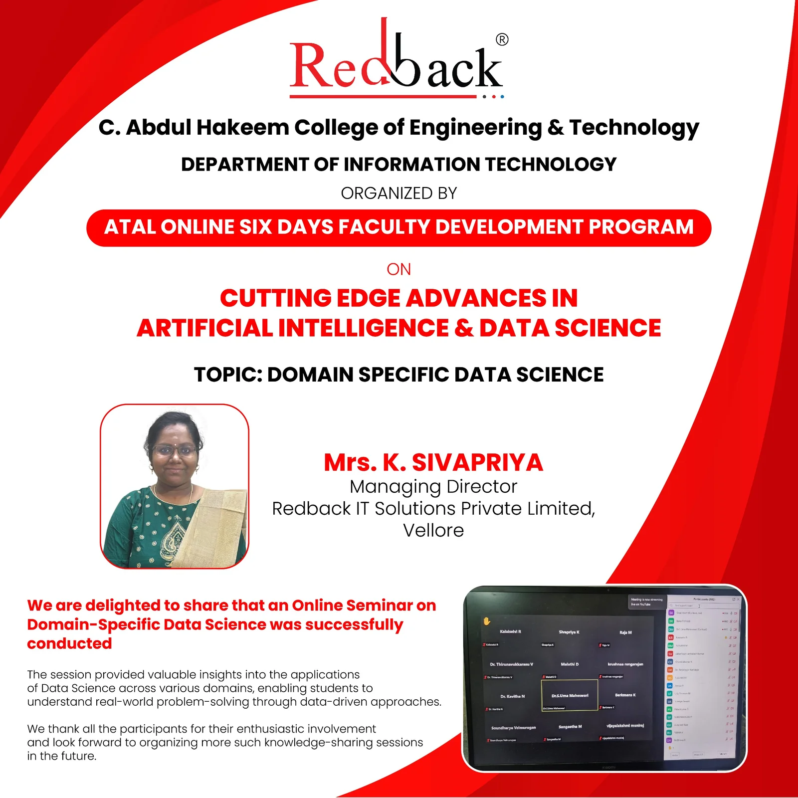 Cyber Secuirty Awareness Program to various colleges around Vellore, Chennai , Kanchipuram and Thirupattur. Strength of 65,000+ from variours colleges has participated in the events.